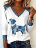 Women's Denim Patchwork Art Jack Russell Terrier Dog Pattern V-neck Long Sleeve T-Shirt