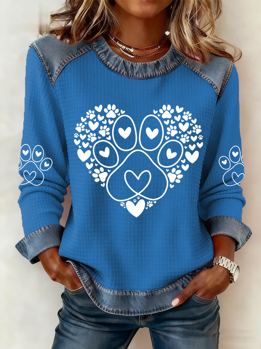 Women's Paw Heart Print Dog Lovers Valentine's Day Casual Denim Patchwork Top