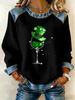 Women's St. Patrick's Day Shamrock Red Wine Glass Print Denim Patchwork Top